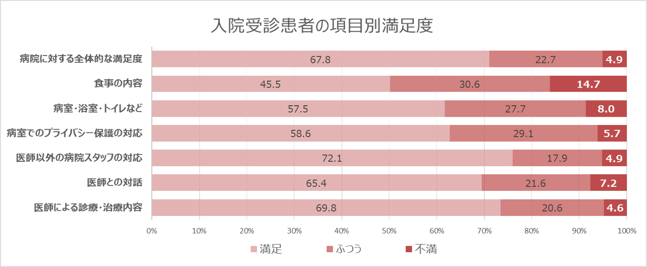 入院患者についても、食事の内容(14.7%)、病室・浴室・トイレの環境(8.0%)、医師との対話(7.2%)に不満を感じているという結果(図2)が出ている。これらの不満は、医療機関の特性上、すぐには改善が難しい部分もあるが、医療者一人ひとりの接遇によって、患者の不安を軽減したり、より良い印象を与えたりすることは十分可能である。