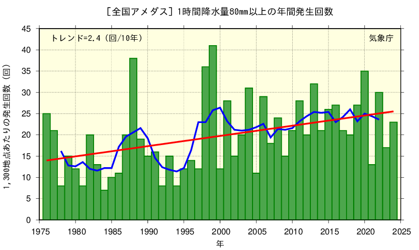 図2 全国(アメダス)の1時間降水量80mm以上の年間発生回数