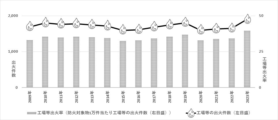 さらに注目すべき指標は、「防火対象物[3]1万件あたりの工場等の出火件数(以下「工場等出火率」)」です。2014年までは比較的安定して推移していましたが、2015年以降は上昇基調に転じました。2019年のピーク後、一度は低下したものの、2021年以降は再上昇し、2023年には過去最高水準に達しています。