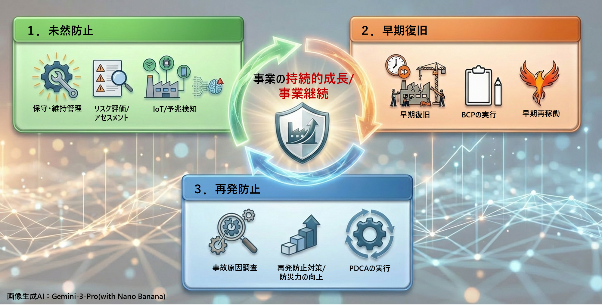 - 未然防止:設備の異常や劣化傾向を保守・維持管理し、定期的な訓練を行うことが基本である。近年は、リスク評価/リスクアセスメントに加え、IoTセンサーやAI技術を活用した「不具合の早期検知・予兆検知」の導入が進んでいる。