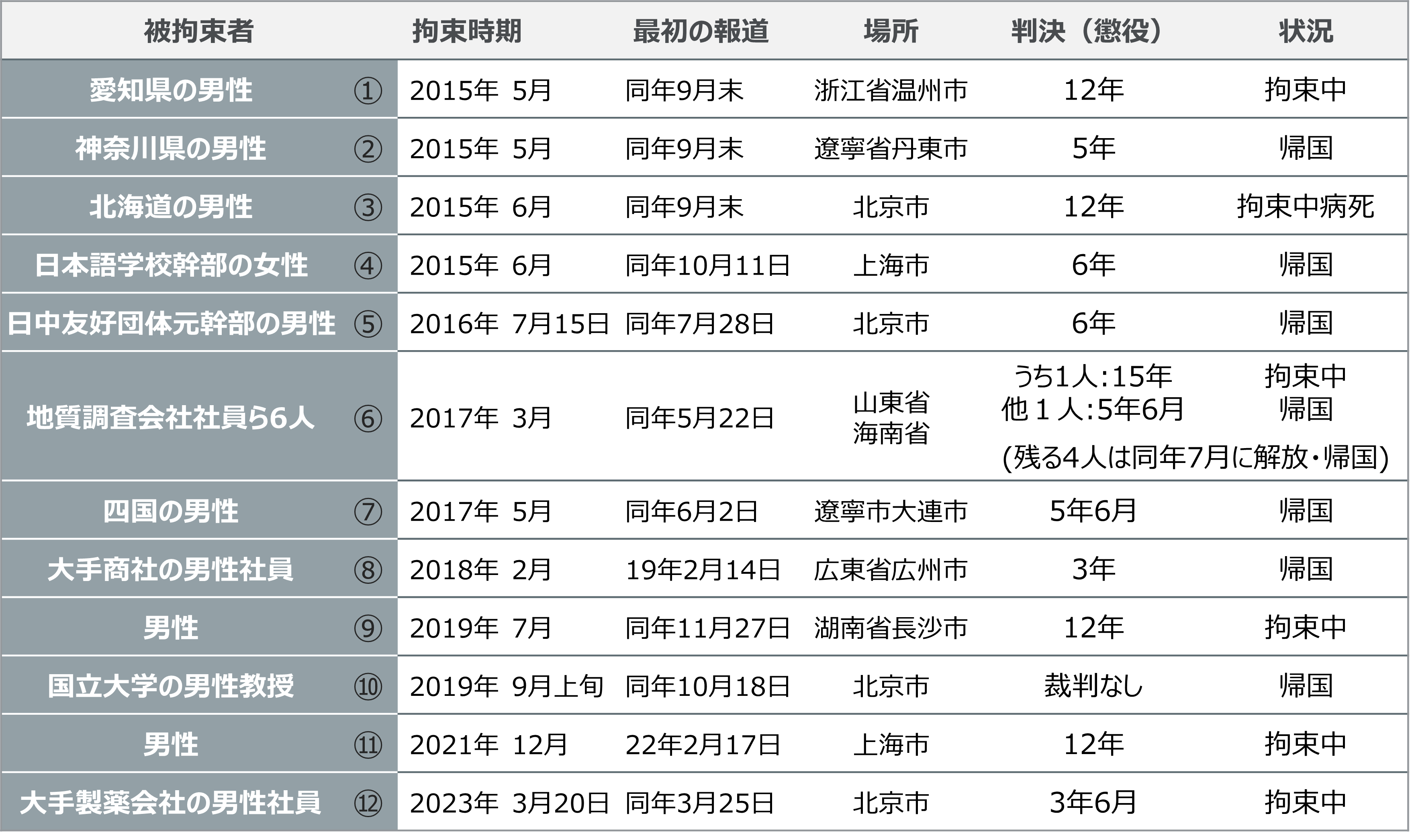 表:中国で「スパイ行為」に絡み日本人が拘束された事案
