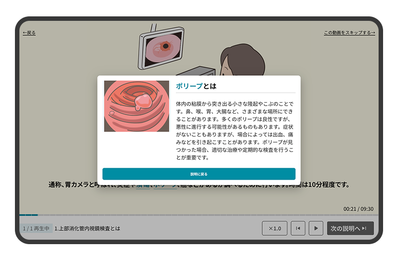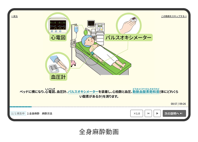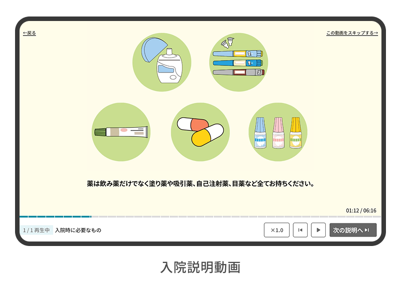 入院、検査、各診療科における標準的な説明を動画にしたもので、