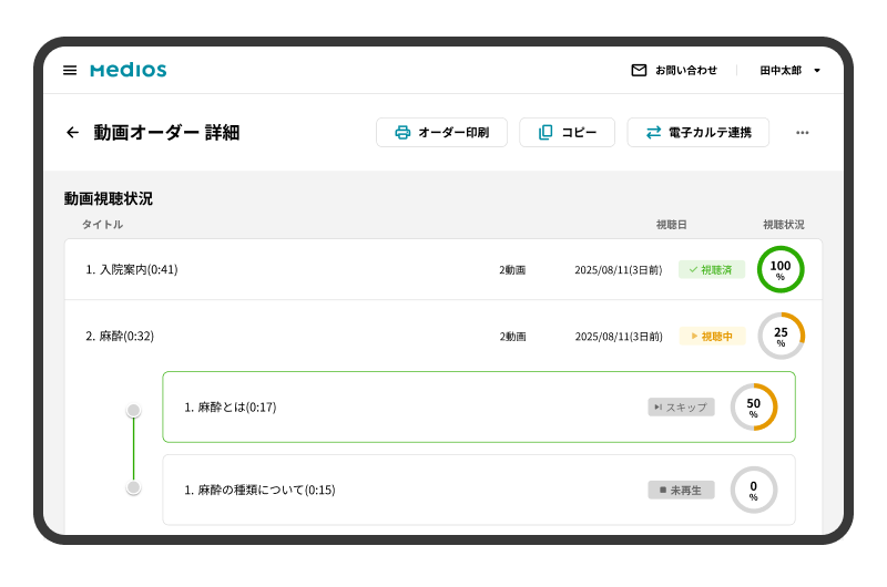 患者さんの視聴状況を詳細に記録できることです。MediOSでは、チャプターごとに視聴状況――視聴済み、視聴完了率○%、繰り返し視聴、スキップ――といった情報を自動で記録します。さらに、患者さん自身が理解度を申告する機能もあるので、医療者はそれらを確認したうえで、対面説明に臨むことができます。