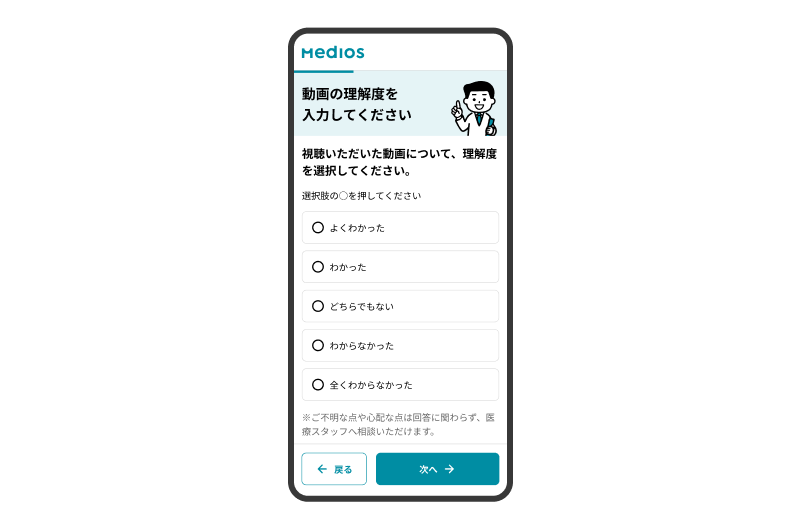 動画視聴後に、患者が自身の理解度を5段階で評価