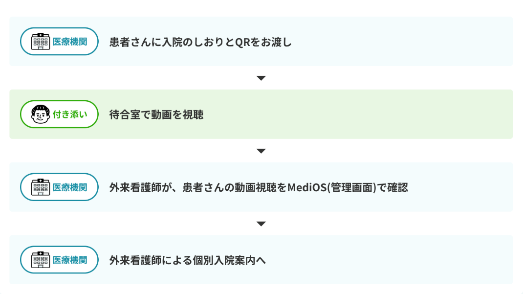 MediOSを導入することで新たに発生する作業――患者さんへの案内や医療職が視聴履歴を確認するタイミングなど――を通常業務のどこに組み込むのか、スマートフォンを持っている人/持っていない人で案内をどのように変えるのか、院内で見るのか/自宅で見てもらうのか、といったフロー設計を綿密にすることが大切です。ここを整理しておかないと、ほぼ確実に活用できません。