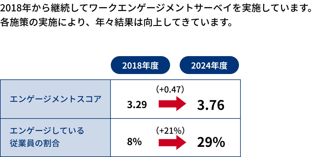 | エンゲージメント | ワークエンゲージメント | 米国Gallup社提供のサーベイ Q.12スコア | 3.53 | 3.65 | 3.65 | 3.76 | 3.77 | |