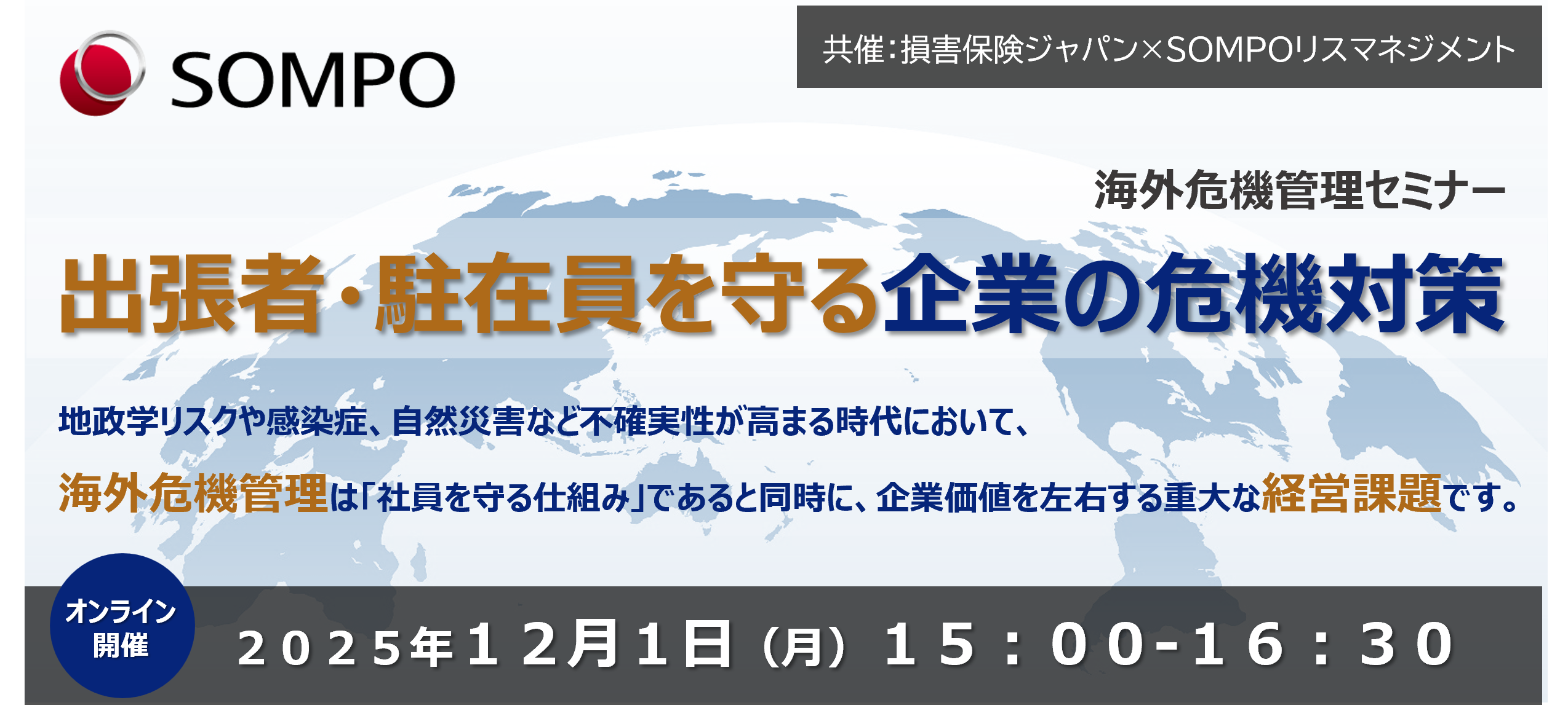 海外出張者や駐在員の安全確保は、グローバルに展開する企業にとって重要な課題です。具体的な事例を交えながら最新の海外リスク動向と危機管理の実務ポイントをご紹介し、出張者・駐在員の安全管理体制の整備や緊急時の対応策について解説し、企業の人事・総務部門様が直面する課題解決の一助となる情報をご提供致します。