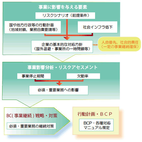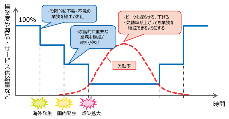 感染症により重要製品・サービスの供給が中断した、中断してしまう可能性を想定し、その影響を軽減するためのBCPを策定します。 - ②新興感染症発生時の行動計画策定
