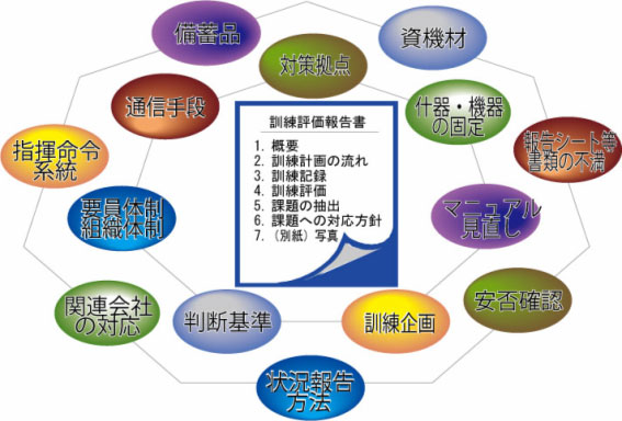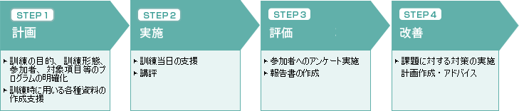 参加者に対しアンケートを実施するなどし、さまざまな視点から評価を行い、報告書にとりまとめます。報告書の提出は、訓練から約1ヶ月後です。