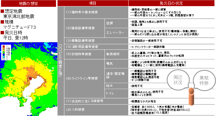 | 被害状況確認 | 他の事業拠点や取引先の被害状況(事前に作成しておく)を収集し、被害状況を集約する訓練。合わせて、今、対策本部としてなすべきことを判断することもできる。 |