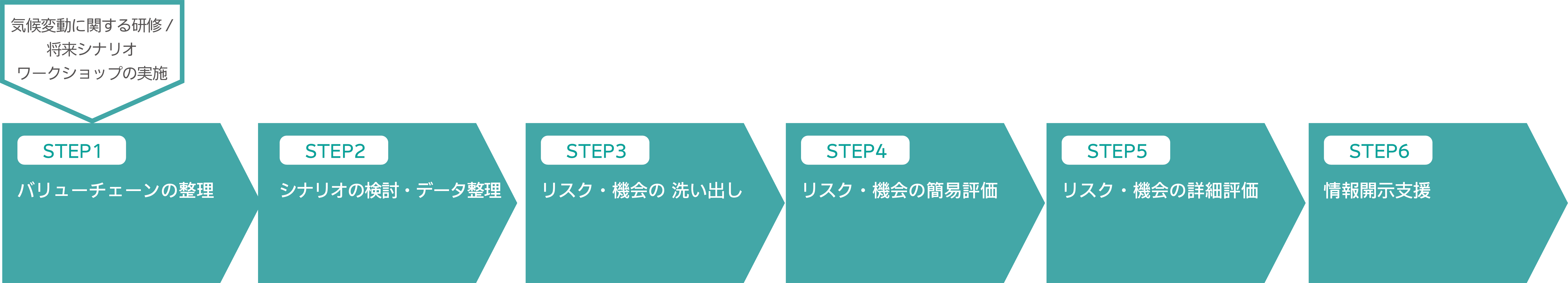 弊社では、気候変動リスク分析の実施に係るご支援として、以下のようなメニューをご用意しています。お客様の状況に応じ、STEPごとにご支援することも可能です。