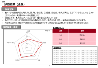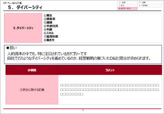 分析・強化・開示の観点から、人的資本に関する貴社のレベルを簡易的に診断いたします。まずは自社の人的資本のレベルがどの程度か、どこのカテゴリーが不足しているかを可視化することが可能です。