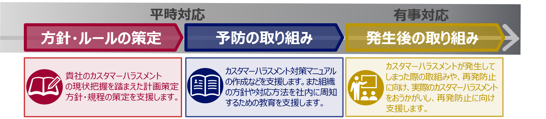 カスタマーハラスメントに係る支援として、以下のメニューをご用意しています。