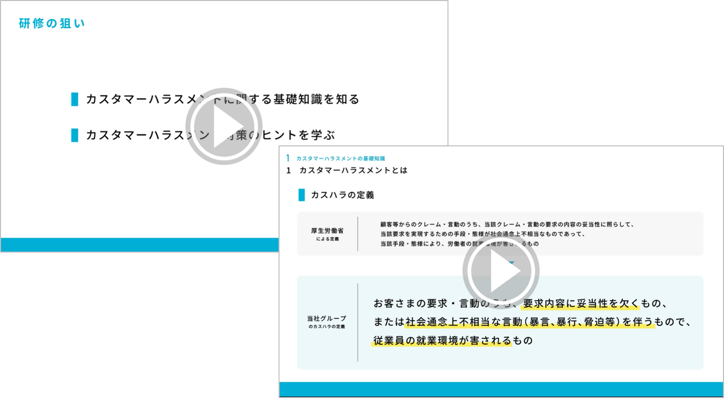 カスハラに関する基礎知識の習得およびカスハラ対策のヒントの学習を目的とした、従業員向けのカスハラ研修動画を作成いたしました※2。内容および研修動画の長さは、現状把握調査結果を踏まえて決定いたしました。