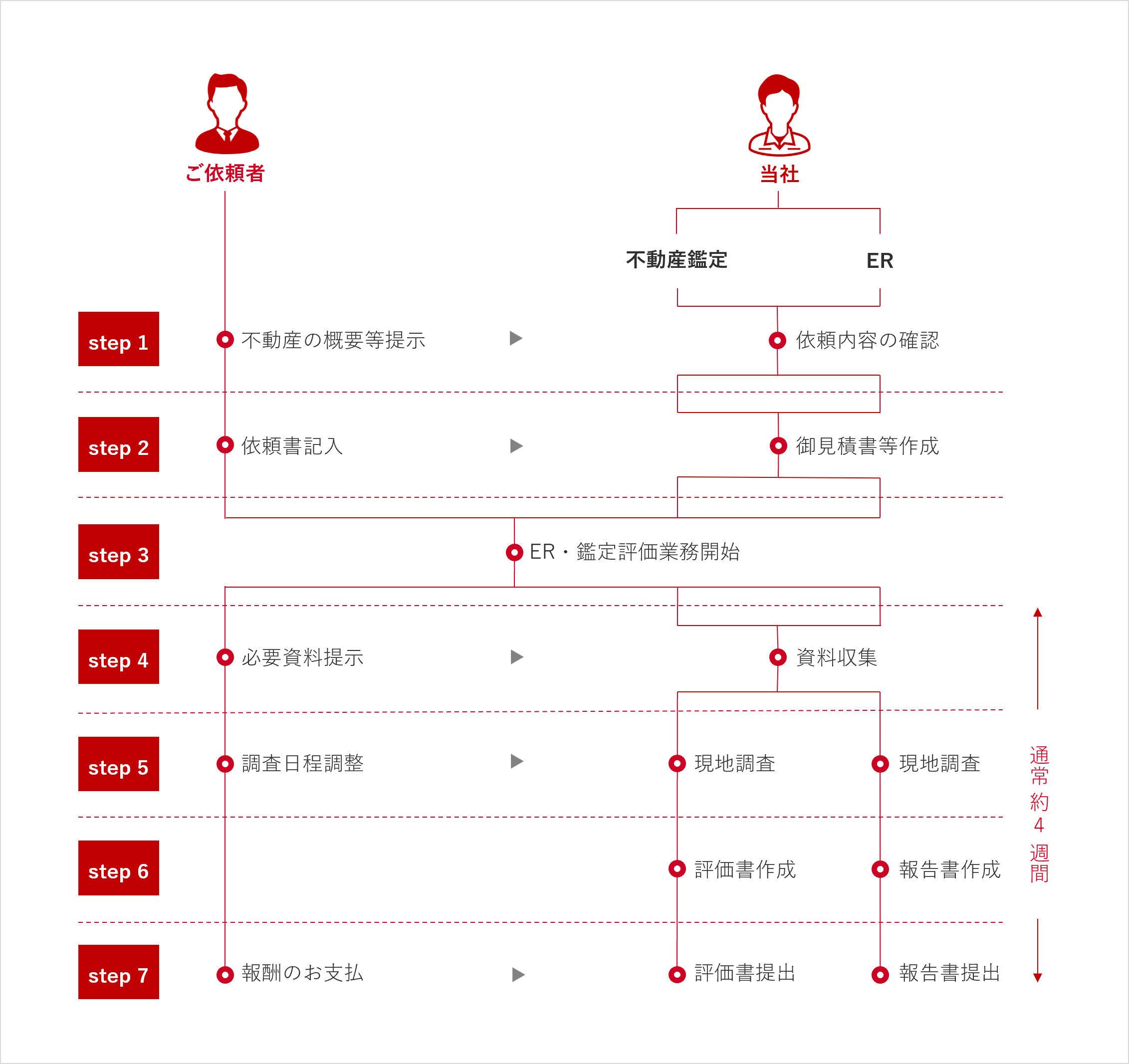 不動産鑑定(経済的デューデリジェンス)とER(物理的デューデリジェンス)を一括発注した場合の流れ