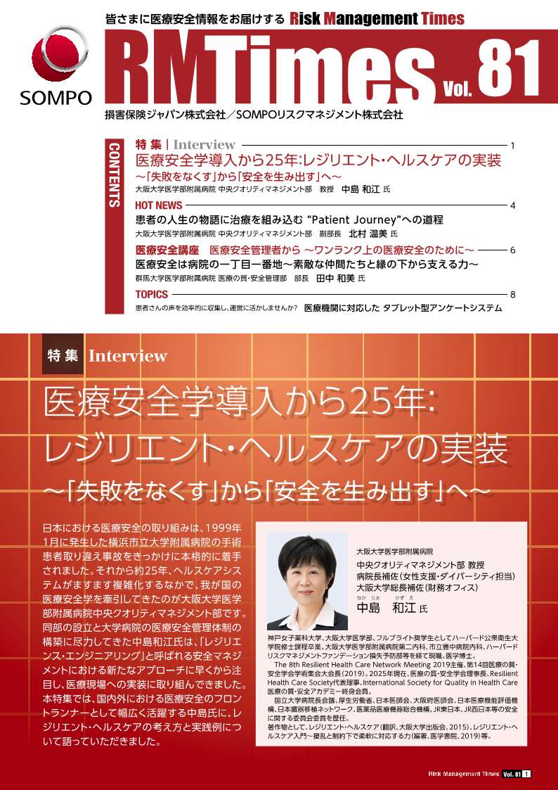 医療安全および最新の医療分野の動向や取組について、有識者の皆様に取材を行い、情報誌として年4回発行しています。皆様が「今欲しい!」と思われる情報を取材したり、医療安全管理者が日々感じる事などをコラムとして掲載しています。
