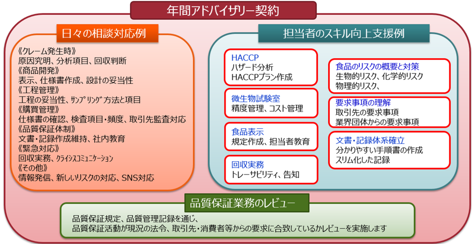 消費者の安心・安全の要求は年々高まっています。その要求に迅速・適切に対応するためには品質保証部門の人材育成が急務です。年間アドバイザリー契約を締結し、品質保証業務を進める上で、日々発生する疑問・課題への相談対応を行うとともに品質保証担当者に求められる力量向上を指南いたします。