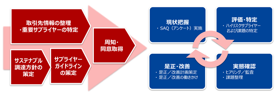 当社は、サステナブル調達方針の策定からサプライヤーへの周知・浸透、アンケートや監査等による実態把握、対話を通じた改善に至るまで、サステナブル・サプライチェーン・マネジメント(SSCM)の構築・高度化を支援します。