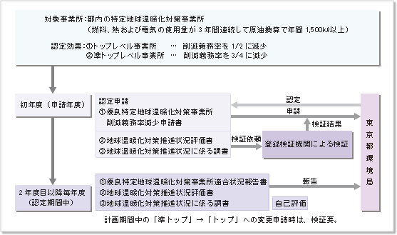 「東京都キャップ&トレード制度」では、「地球温暖化の対策の推進の程度が特に優れた事業所(優良特定地球温暖化対策事業所)」として、「知事が定める基準」に適合すると知事が認めたとき、当該対象事業所は、削減義務率を地球温暖化対策の推進の程度に応じて軽減することができます。対象事業所が優良特定地球温暖化対策事業所の認定申請をする場合、その正確性・信頼性を確保するため、第三者による検証を義務付けており、検証業務を実施できるのは、東京都が登録を認めた検証機関に限定されています。