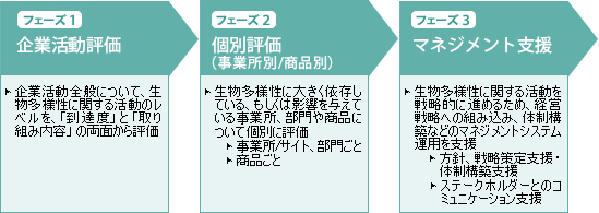 生物多様性に大きく依存している、あるいは影響を与えている事業所・部門や商品について、個別に評価します。事業所・部門については、生物多様性に関連する現在・将来のリスクを分析し、具体的な取り組み課題を抽出することにより、リスクをビジネスチャンスへとつなげていくことが可能です。また、商品を生物多様性の観点から評価することを通じて、既存のものを生物多様性に配慮した商品として見直すことができるため、新たな付加価値の創出につなげることができます。