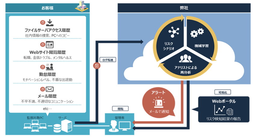 企業内のログデータや管理情報から「ヒト」の行動を解析し、企業内部での「異常行動」や、その「動機」「可能性」「兆候」を持つ人物を検知・可視化し、重大なインシデントの発生を未然に防ぐためのサービスです。