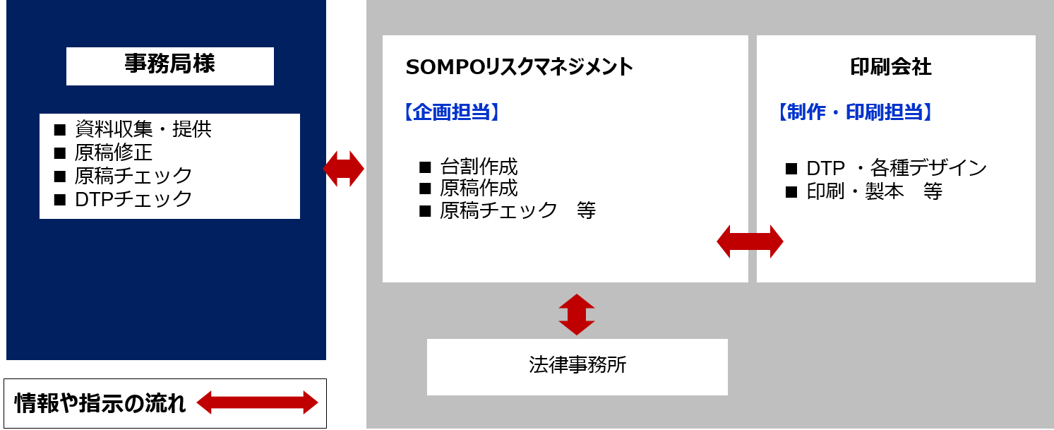 ※法的な観点については貴社顧問弁護士等にチェックいただくこととすることも可能です。また、デザイン・印刷に ついては支援内容に含めないことも可能です。