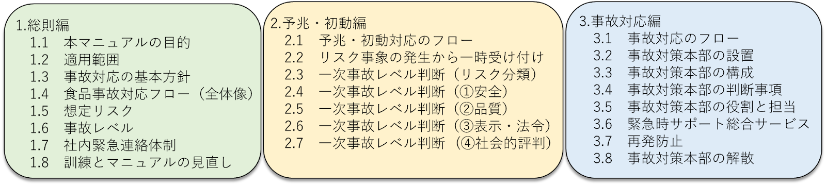 食品事故対応基礎マニュアルは、総則編、予兆・初動編、事故対応編の3部構成になっており、対応すべき事項を漏れなく提示し、分かりやすさを重視した内容にしています。